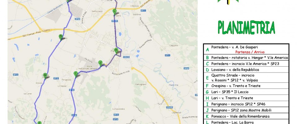 Quest’anno sarà riproposto il medesimo percorso dell’anno precedente; 33 km tra le belle colline pisane, attraverso i comuni di Pontedera, Casciana Terme Lari, Crespina Lorenzana e Ponsacco. Il fulcro della gara, con uffici e punto ristoro, come di consueto sarà il Centro Bellaria Cappuccini.